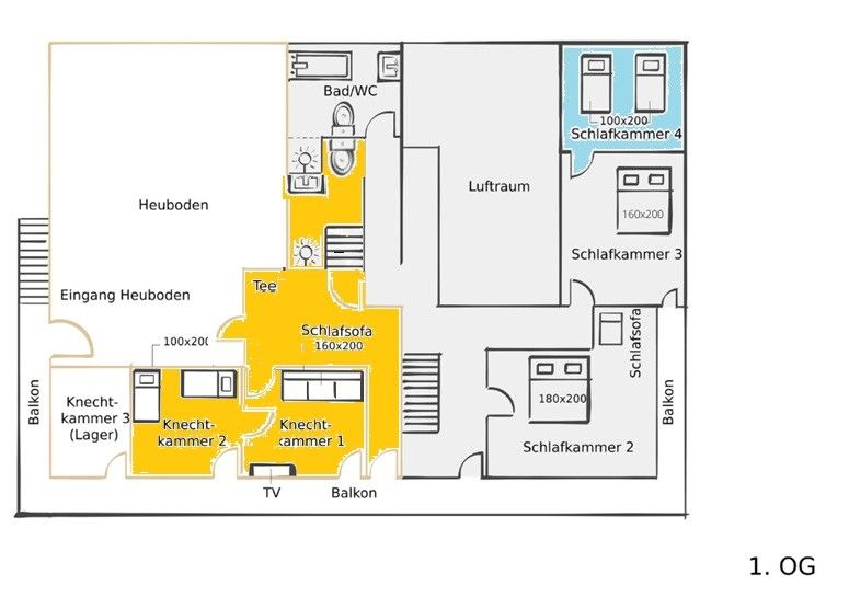 Bei größeren Gruppen, dh mehr als 6 Personen, öffnen wir auf Anfrage die Schlafkammer 4.