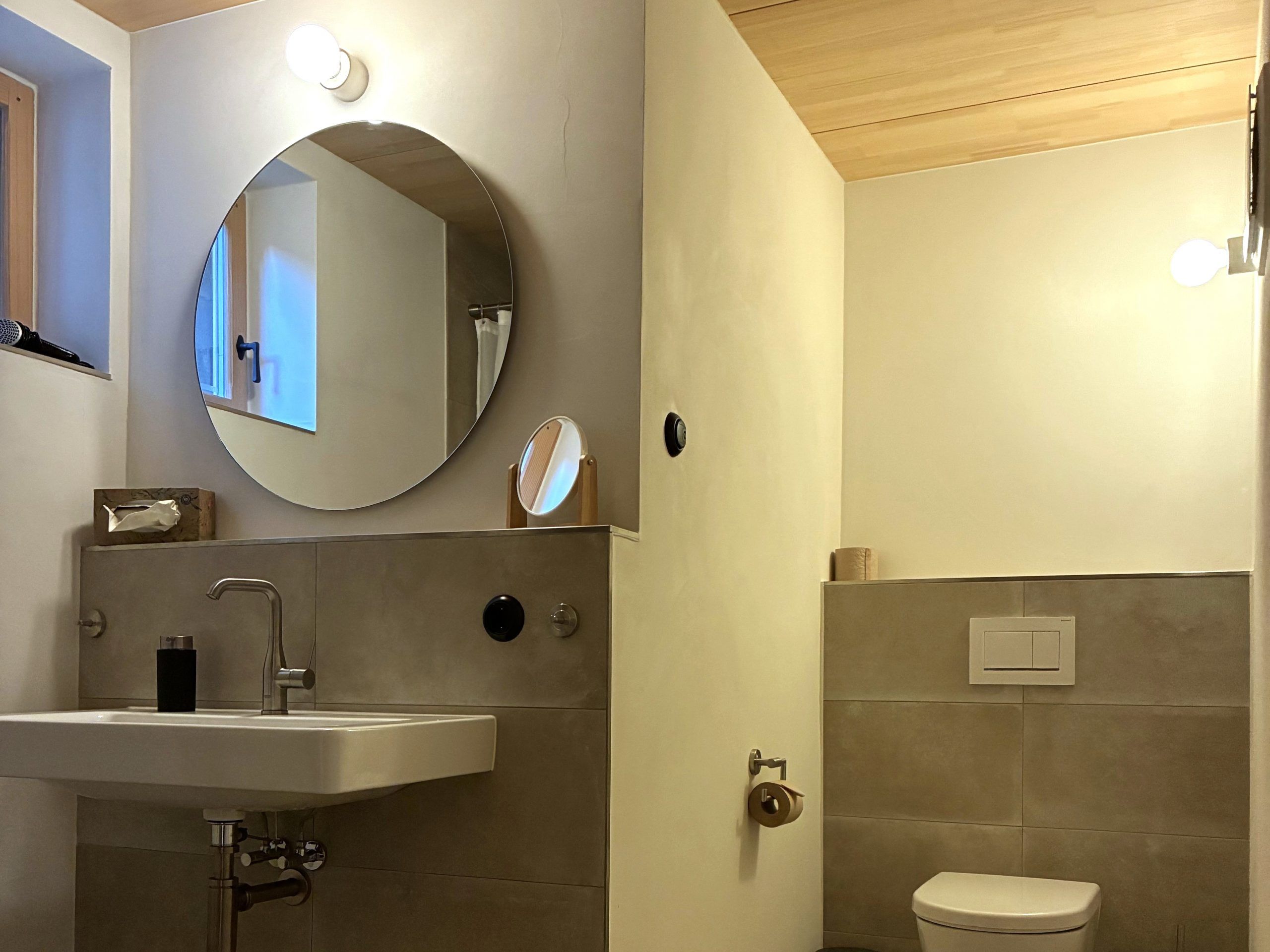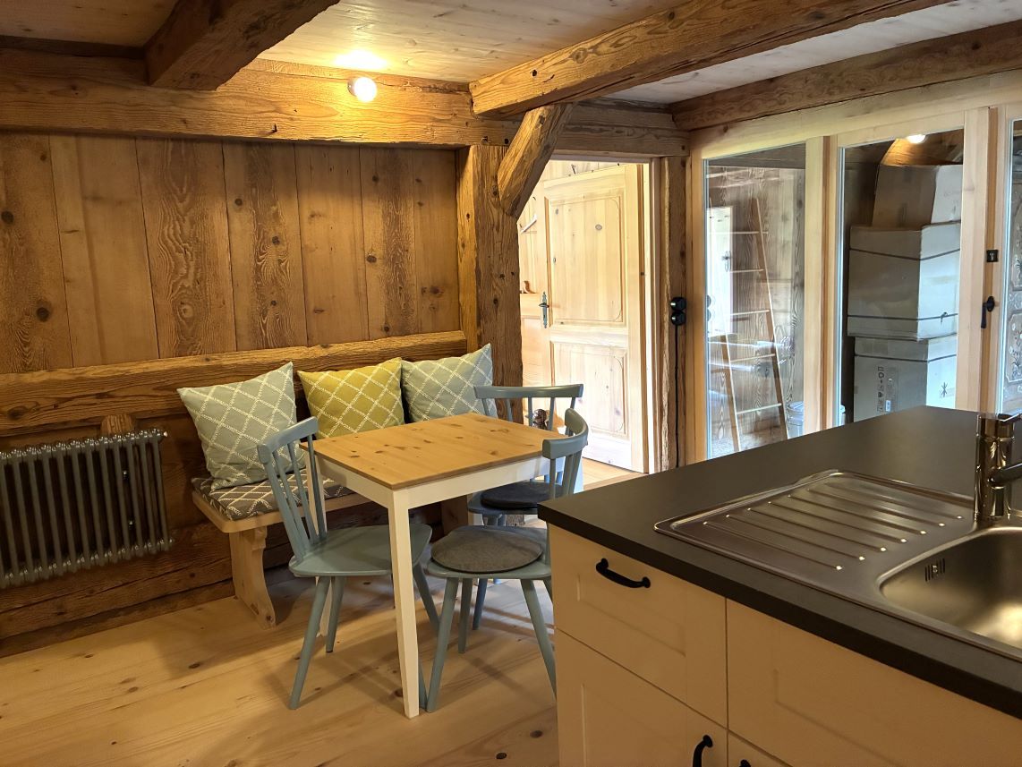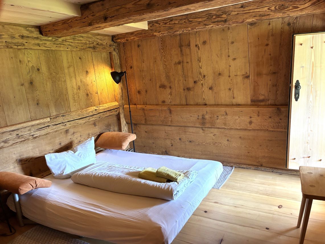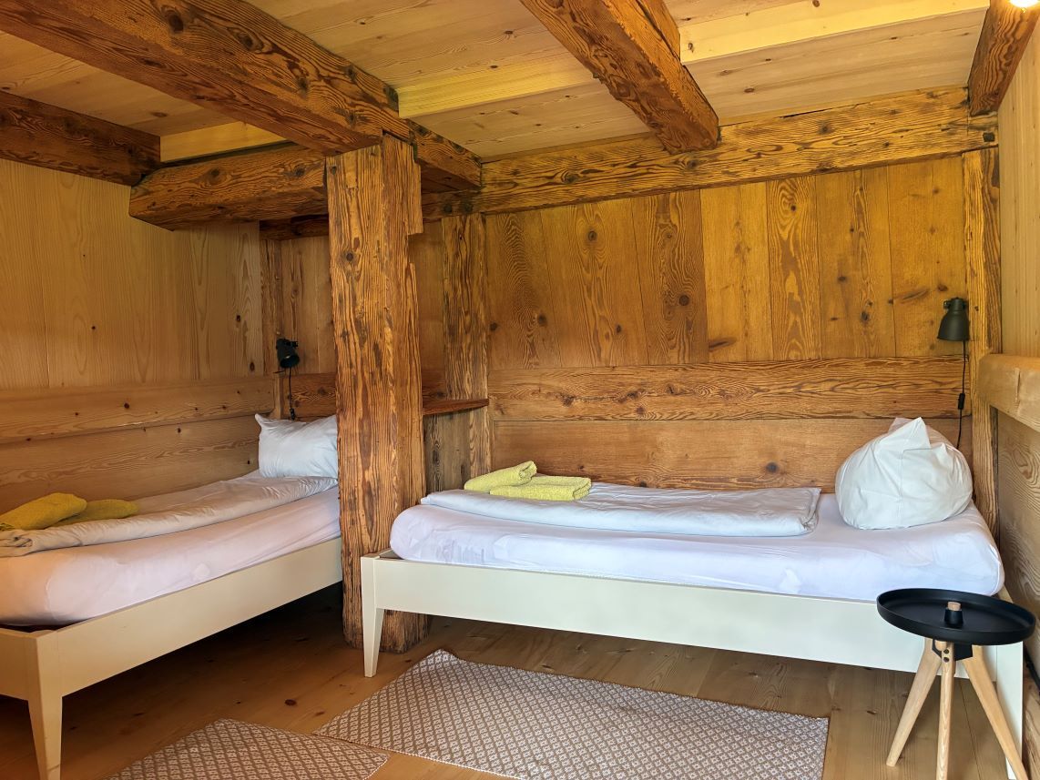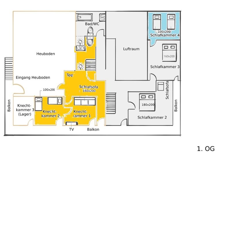 Das ist nun etwas komfortabler. Ein separates Bad, eine Teeküche und 2 Kammern (siehe Grundriss und Bilder) beherbergen bis zu 4 Personen. Die Räume sind alle aus Holz und untereinander durch Türen verbunden. Durch die Außentüren gelangt man aber immer über den Balkon (Trippel) wieder in die Teeküche oder zum Bad. Dadurch ist die Knechtskammer 1 auch kein Durchgangszimmer. Da alle Wände im Hof einfache Holzwände sind, wird die Knechtwohnung immer nur zusammen mit der Gruppe der Hauptwohnung vermietet. Die Knechtkammer 2 hat 2 Einzelbetten, die Knechtkammer 1 ein Klappsofa (Multi;LigneRoset). Dadurch ergeben sich in der Summe knapp 55m² Wohnraum, und es eröffnet sich auch der sog. Heuboden (nicht beheizt) als Scheunen-artiger Vorraum.